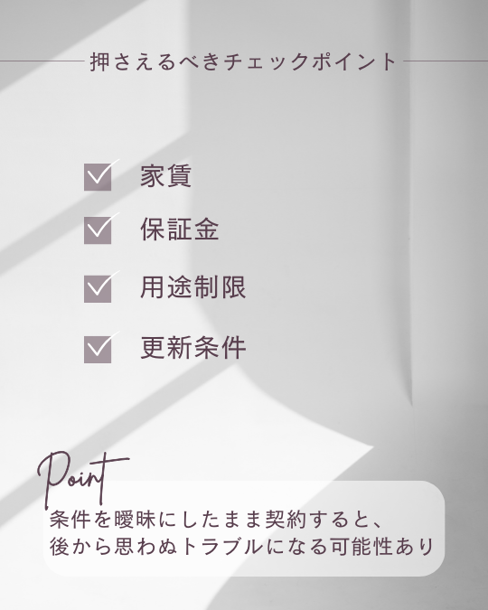 条件を曖昧にしたまま契約すると、後から思わぬトラブルになる可能性があります。